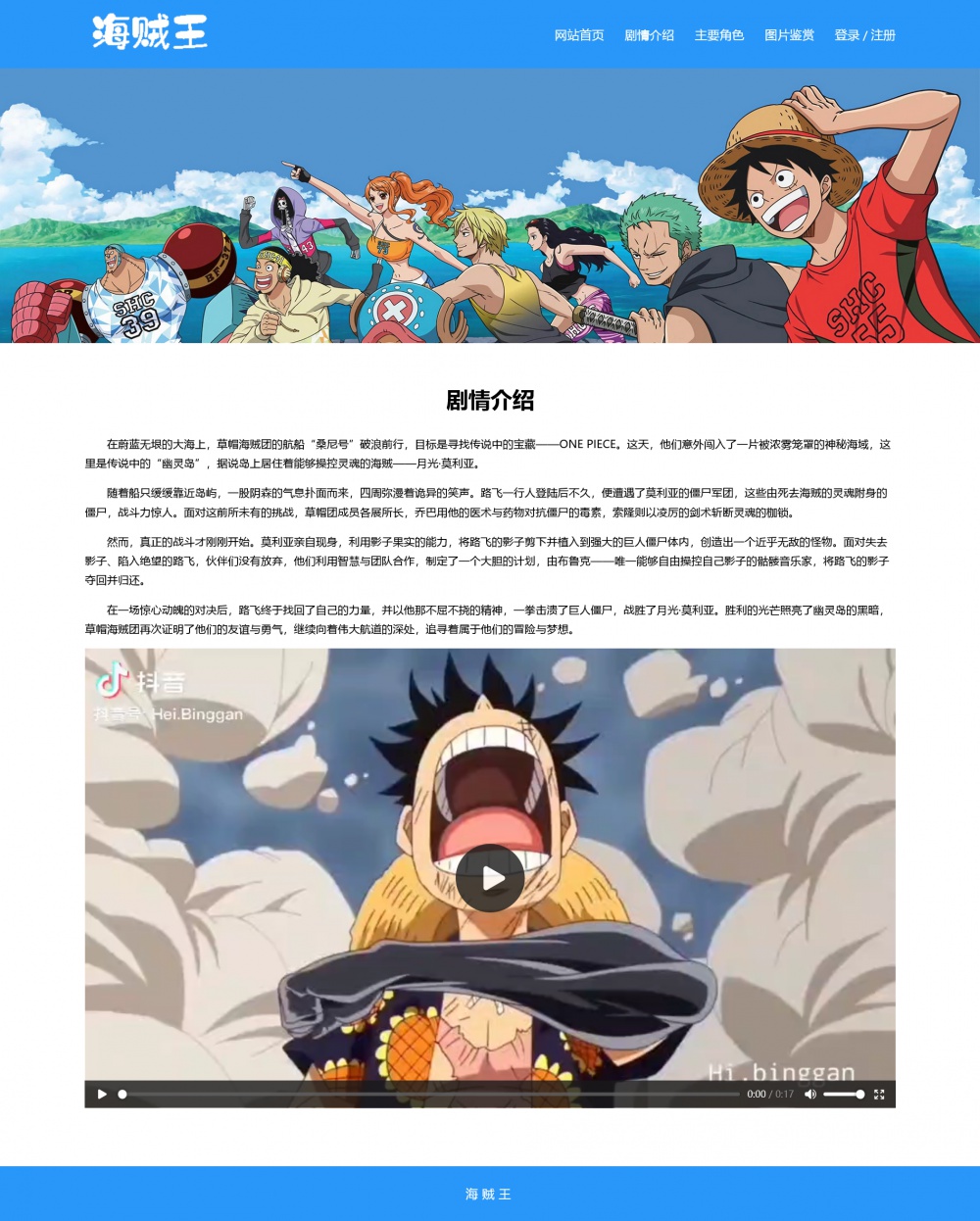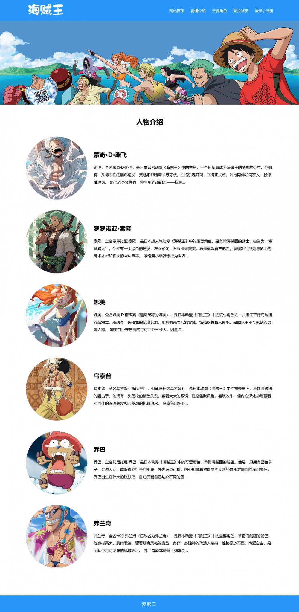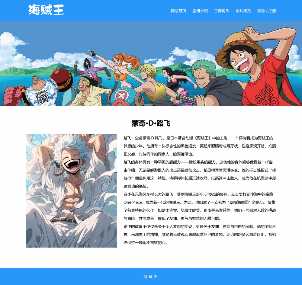动漫网页设计模板《海贼王》,网页采用了天空蓝主题色,搭配天真烂漫的图片,整体给人阳光向上的感觉。默认是6页版本,可以勾选加三级页面来生成12页的版本。可以更换主题,添加想要的网页技术(不添加则为简单版本),选择多页或少页版本,非常灵活,选完点击下载即可。可作为海贼王前端网页模板,海贼王网页设计作业等。