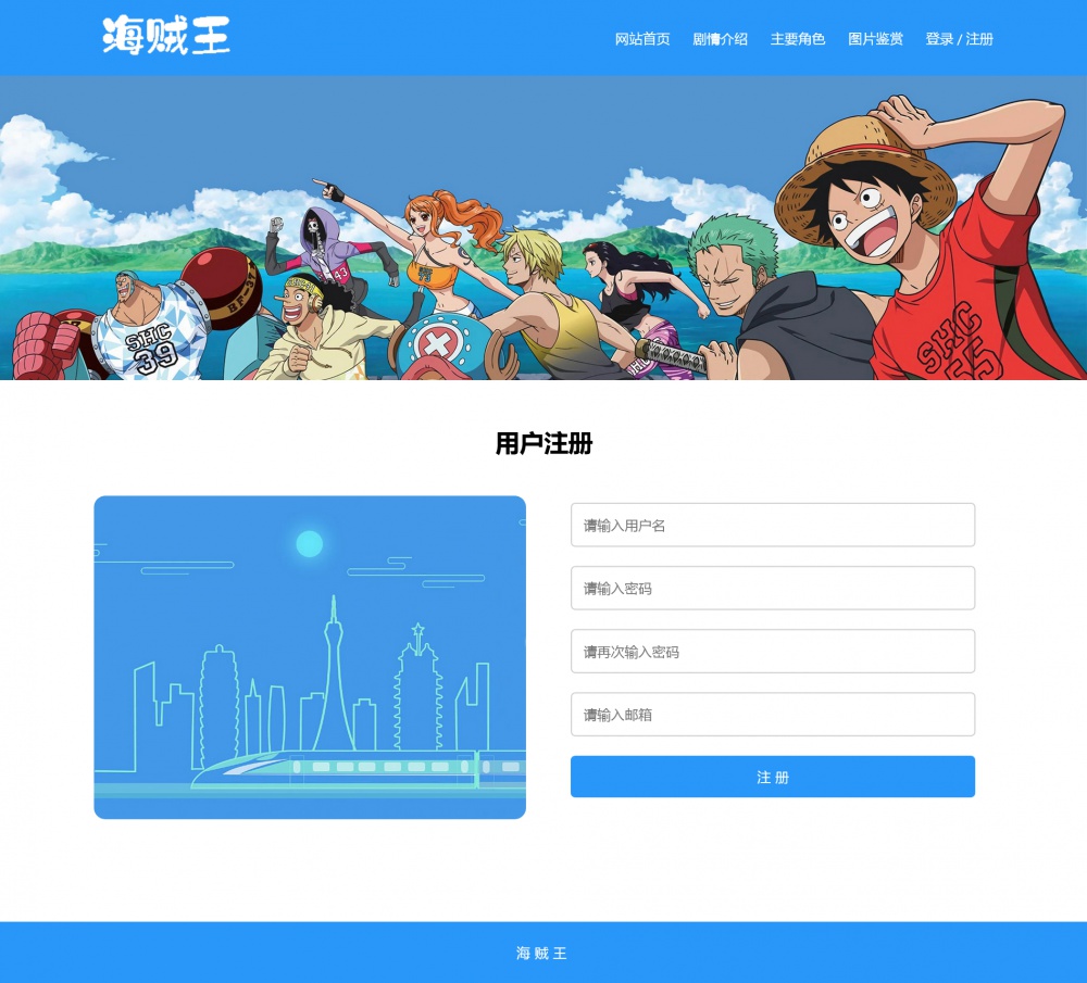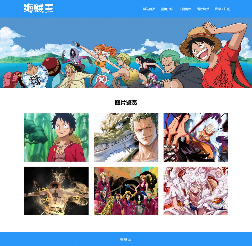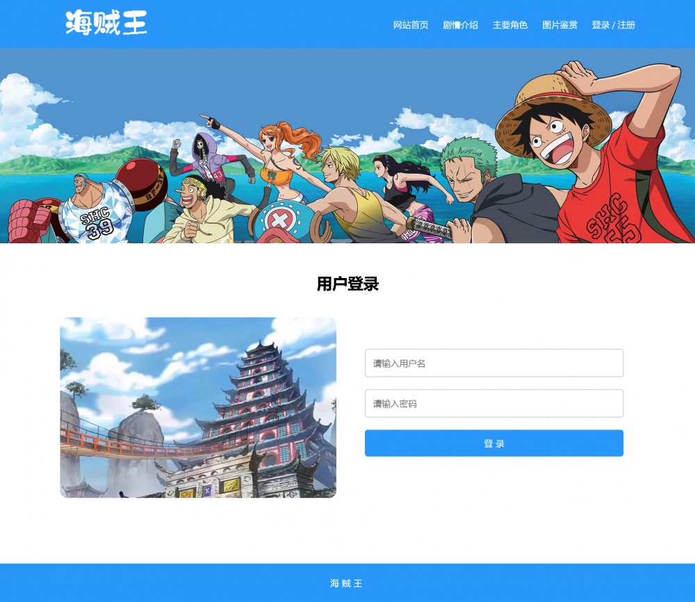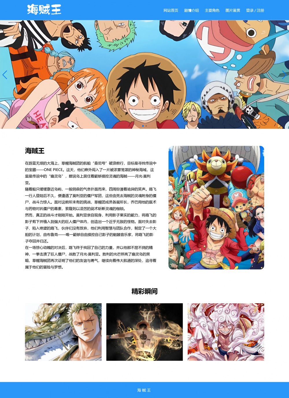 动漫网页设计模板《海贼王》,网页采用了天空蓝主题色,搭配天真烂漫的图片,整体给人阳光向上的感觉。默认是6页版本,可以勾选加三级页面来生成12页的版本。可以更换主题,添加想要的网页技术(不添加则为简单版本),选择多页或少页版本,非常灵活,选完点击下载即可。可作为海贼王前端网页模板,海贼王网页设计作业等。