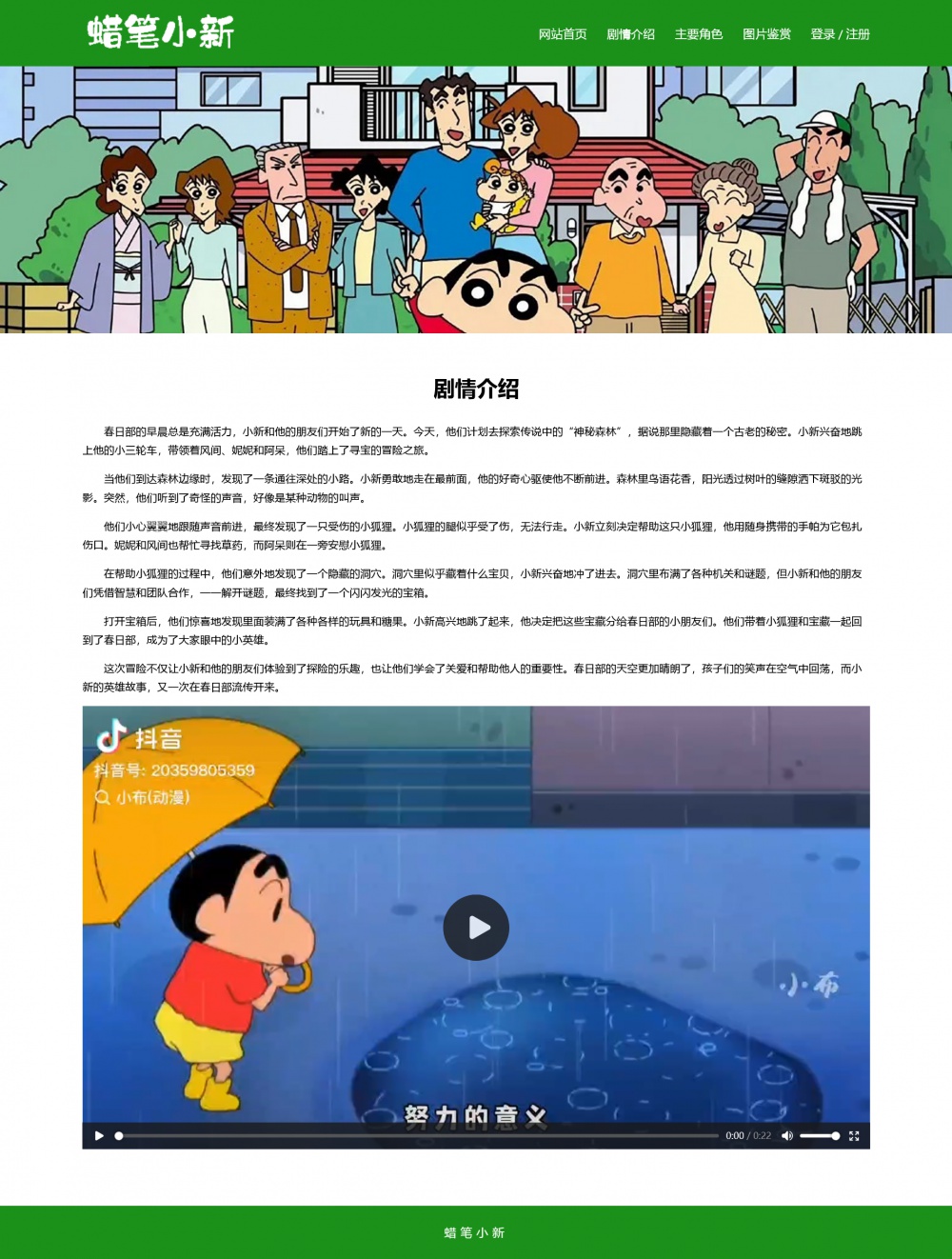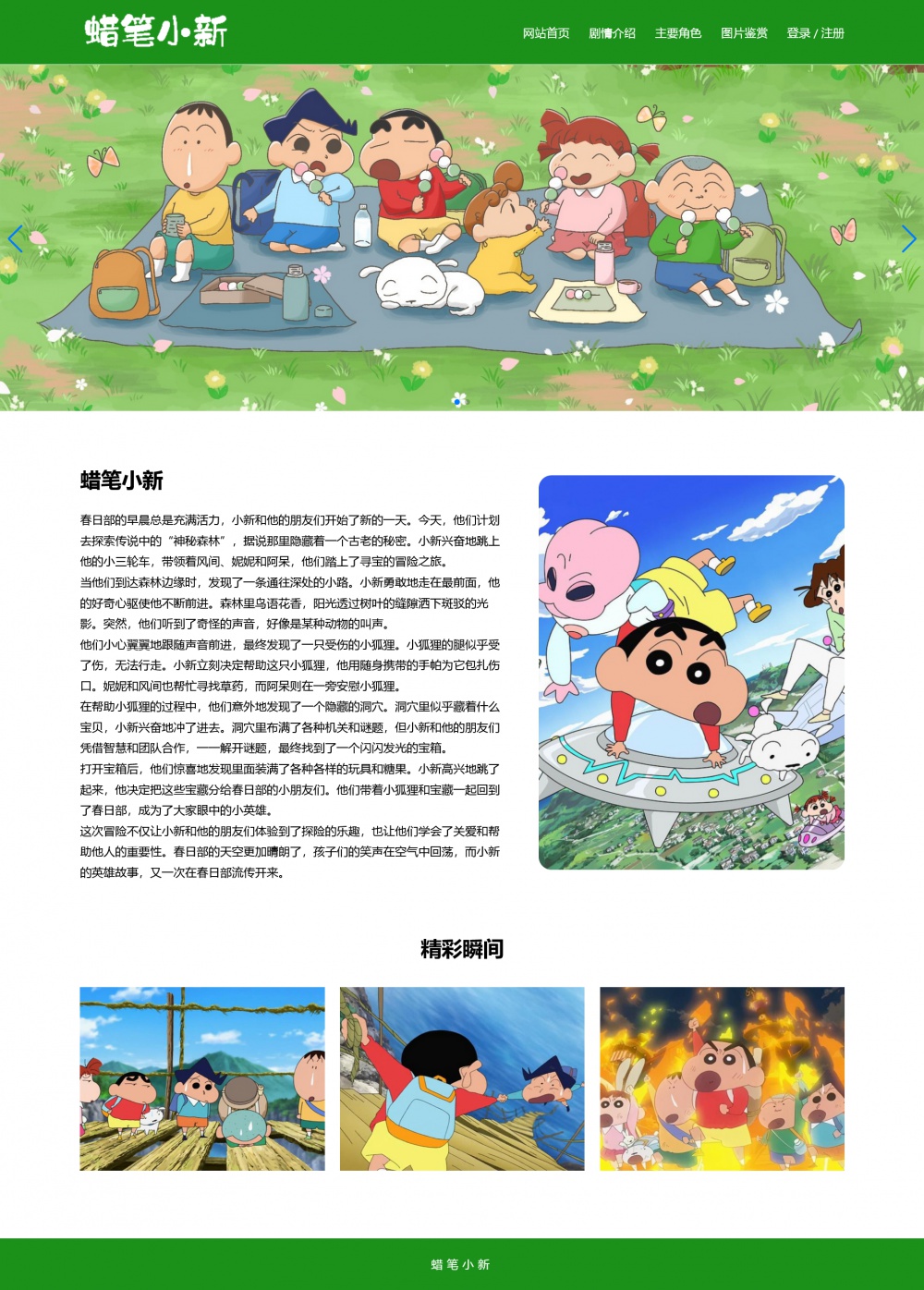 动漫网页设计模板《蜡笔小新》,网页采用了清新绿主题色,搭配小新那调皮捣蛋的图片,整体给人活泼欢快的感觉。可以更换主题,添加想要的网页技术(不添加则为简单版本),选择多页或少页版本,非常灵活,选完点击下载即可。可作为蜡笔小新前端网页模板,蜡笔小新网页设计作业等。