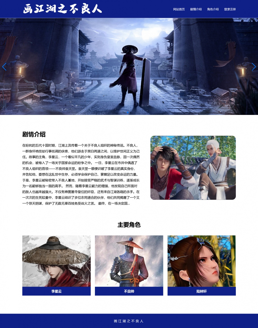 动漫网页设计模板《画江湖之不良人》,单页网页模板。可以更换主题,添加网页技术(不添加则为简单的HTML+CSS版本),选完点击下载即可。可作为画江湖之不良人前端网页模板,画江湖之不良人网页设计作业等。