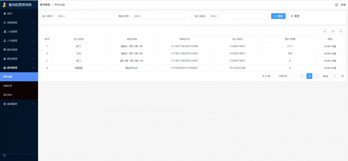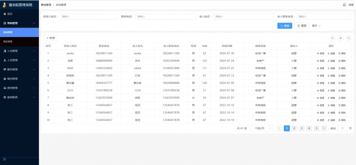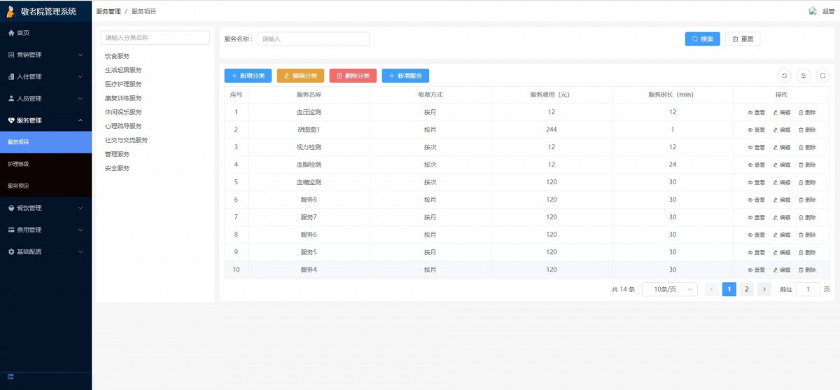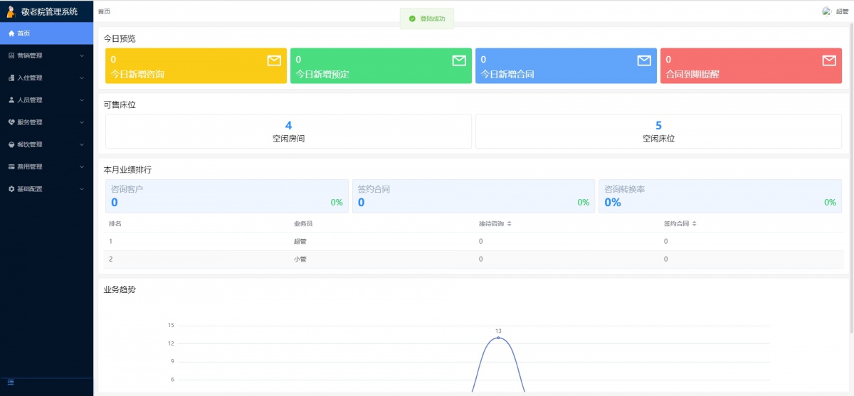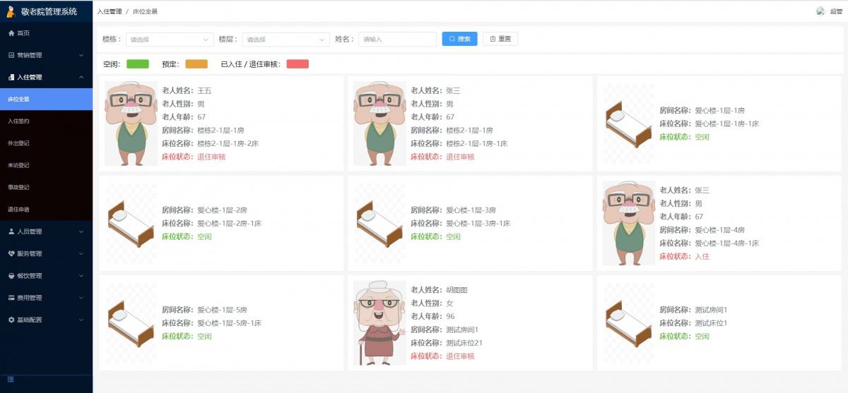 2、咨询管理、预定管理、床位全景、入住签约、外出登记、来访登记、事故登记、退住申请、长者档案、员工管理、服务项目、护理等级、服务预定、菜品管理、餐饮套餐、点餐、预存充值、消费记录、退住审核、房间类型、楼栋管理