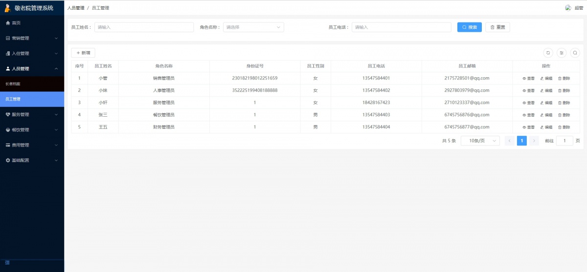 包含角色:超级管理员、销售管理员、人事管理员、服务管理员、餐饮管理员、财务管理员