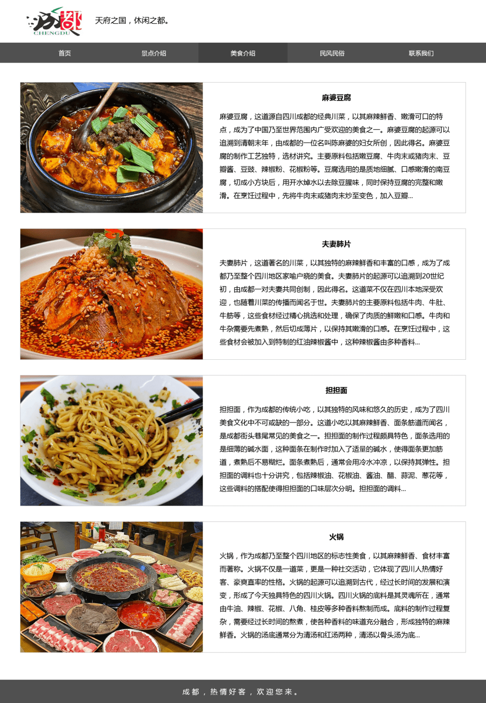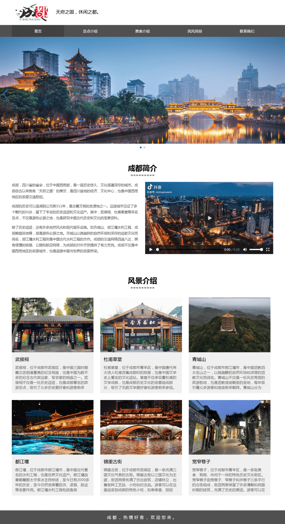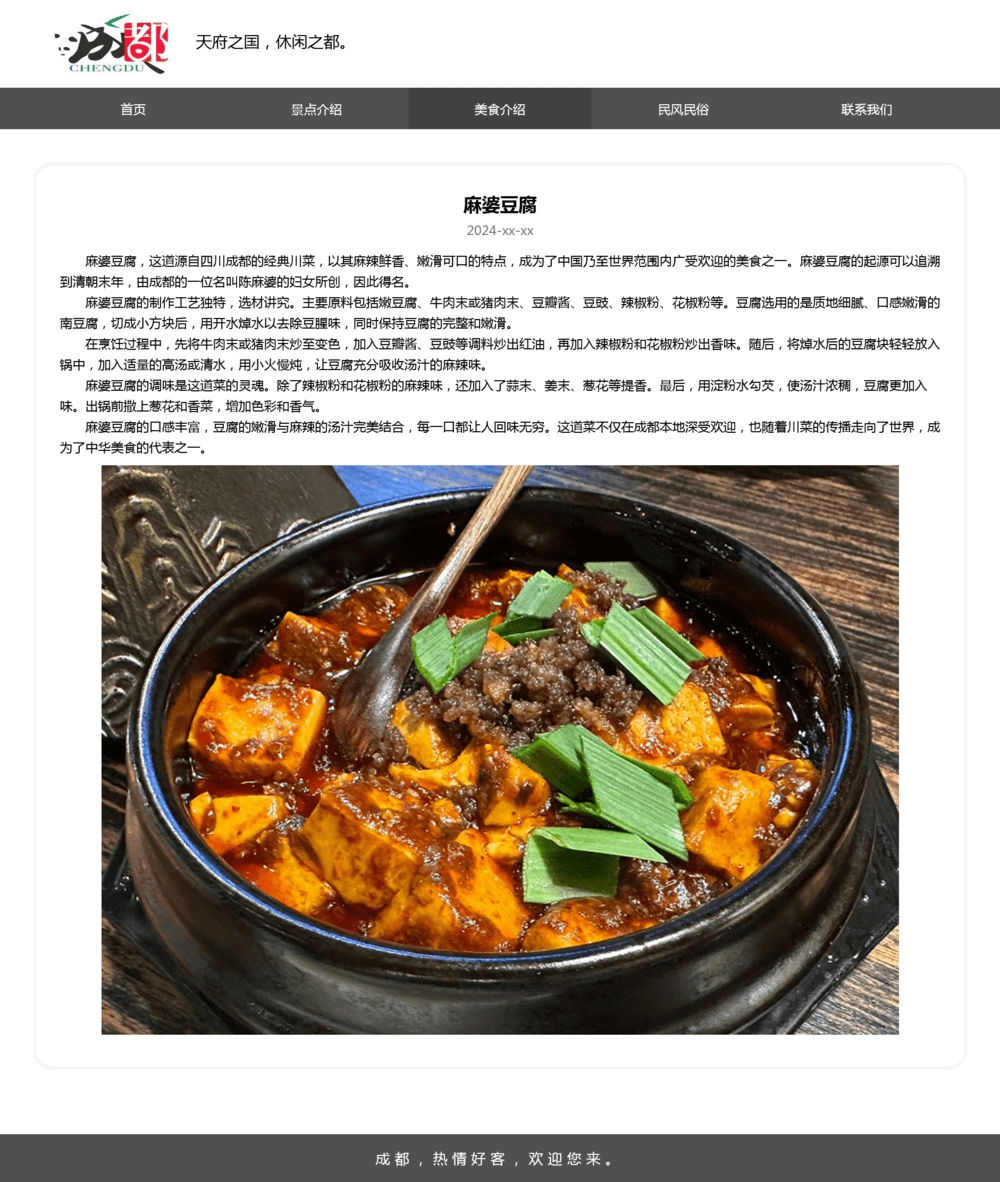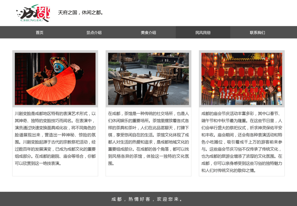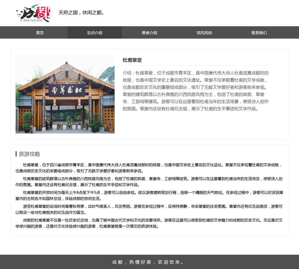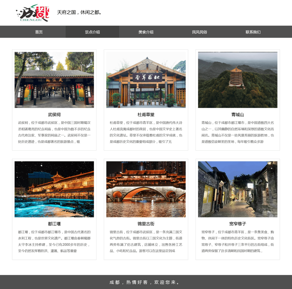 可作为成都家乡旅游网页设计作业,或成都介绍网站前端页面。