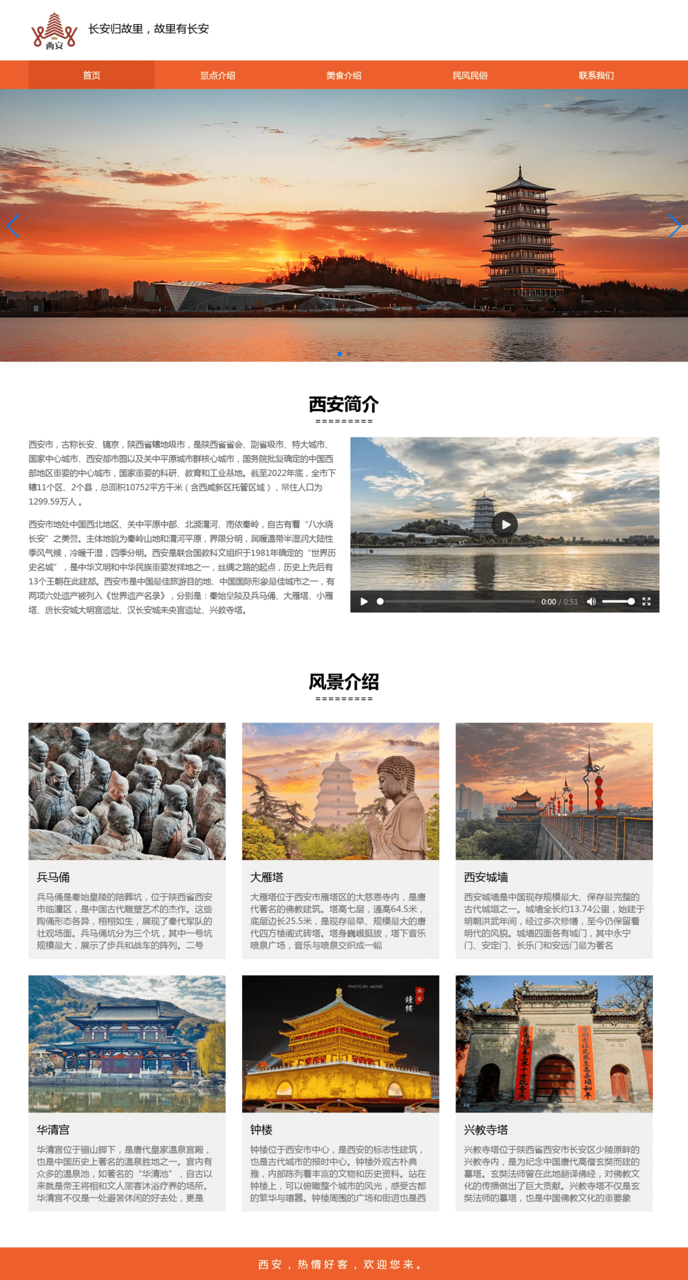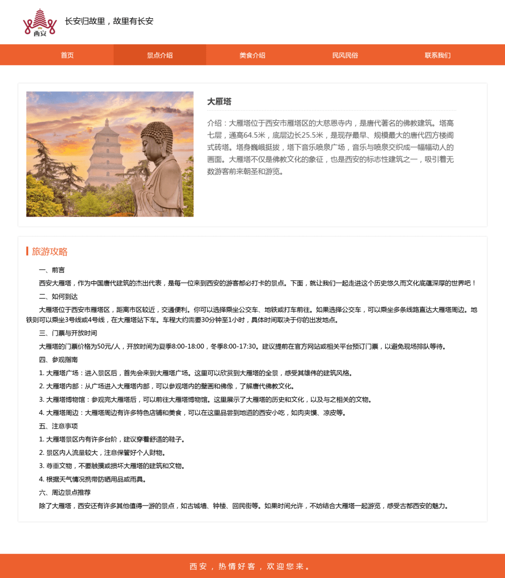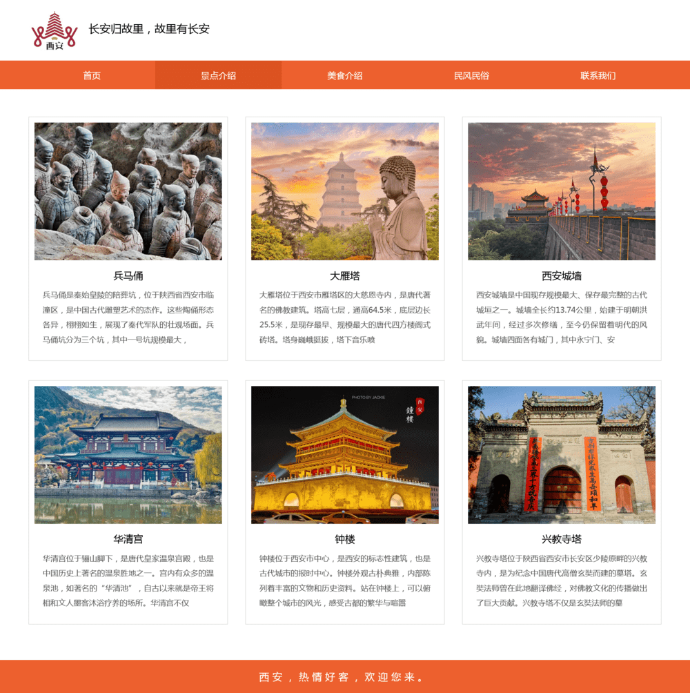 西安介绍的网页设计模板,采用了“夕阳红”色彩主题,突出了西安这座城市独特的历史韵味与时代印记。