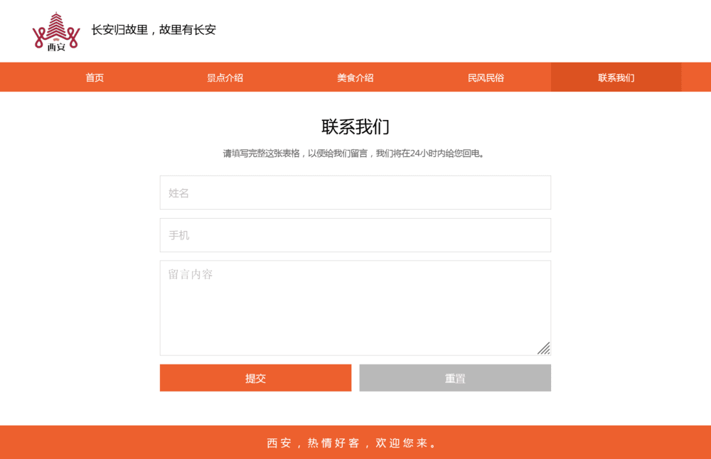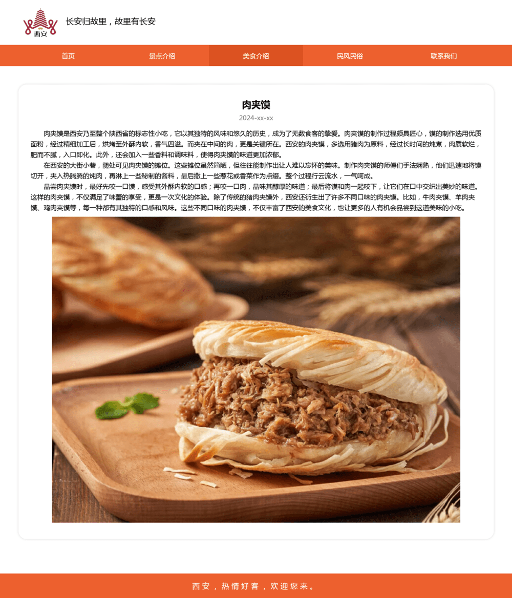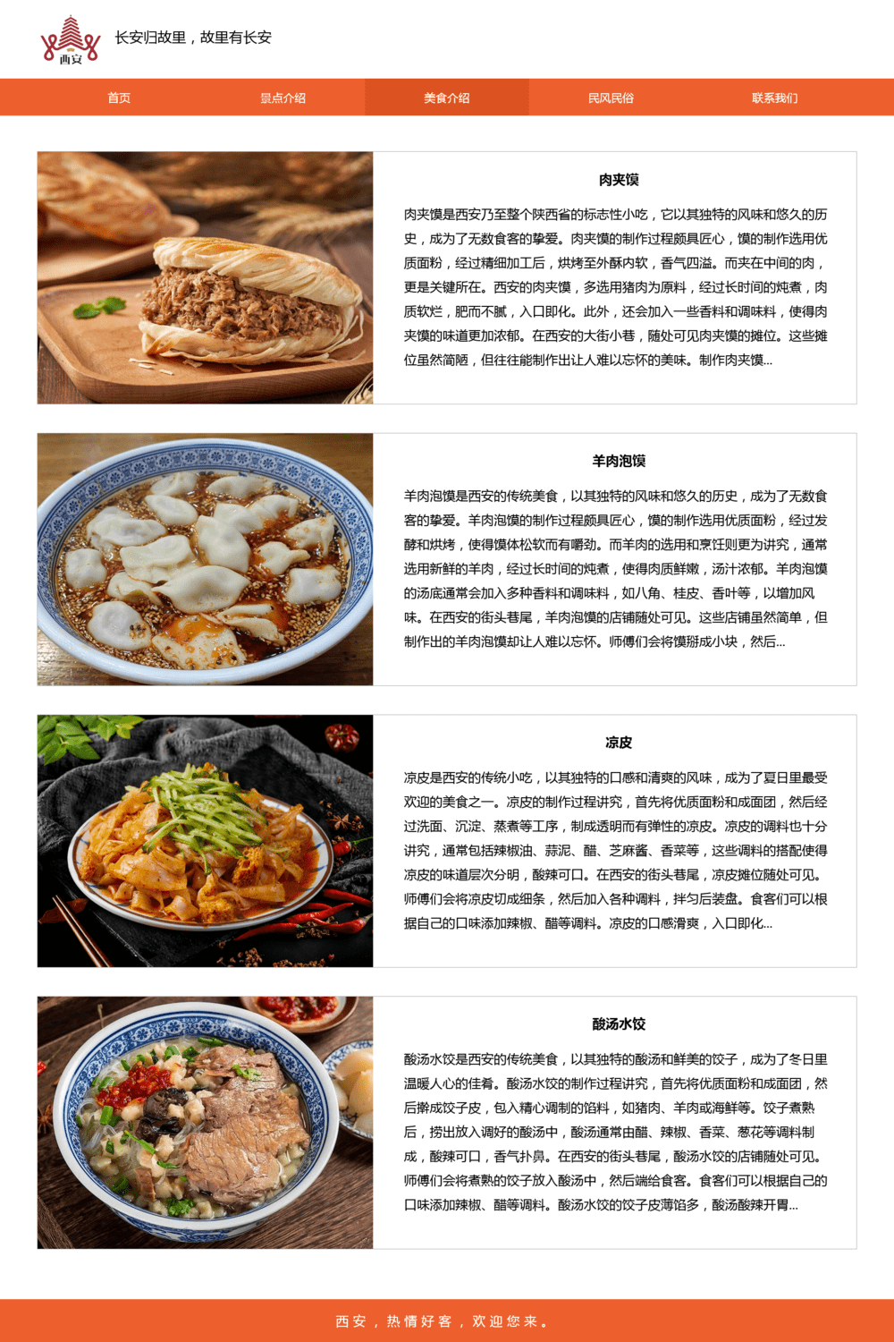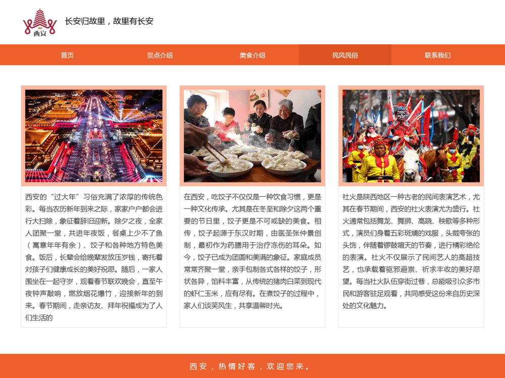 西安介绍的网页设计模板,采用了“夕阳红”色彩主题,突出了西安这座城市独特的历史韵味与时代印记。