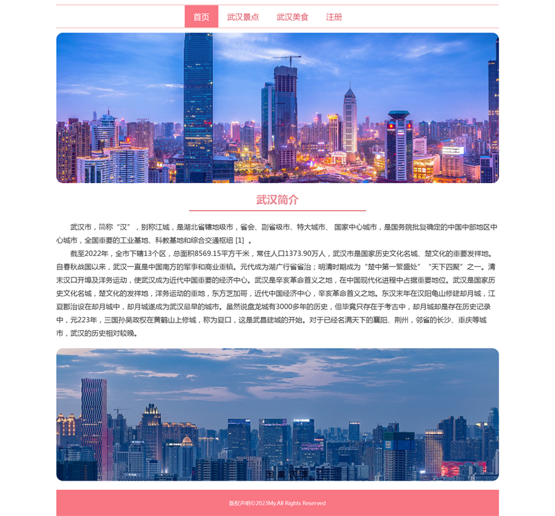 模板包含4个页面,适合作为武汉介绍类的web课程期末大作业参考案例,如武汉旅游景点介绍html模板,武汉家乡介绍html模板等。每个页面都是手动编写代码,原创度高。