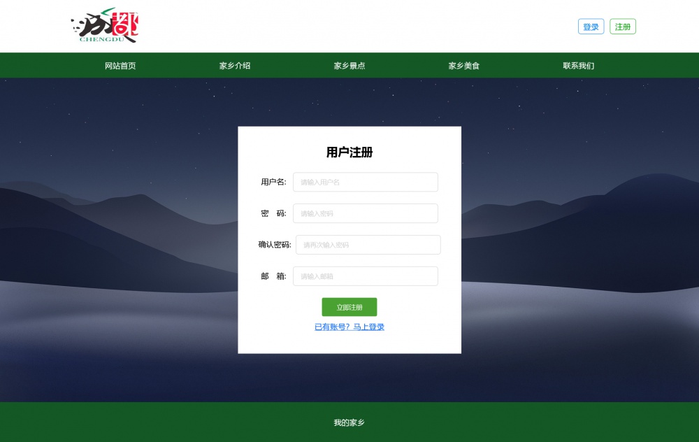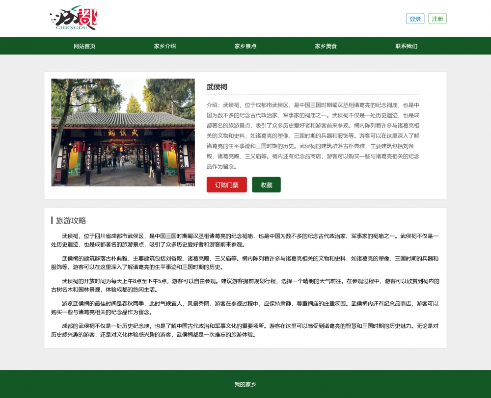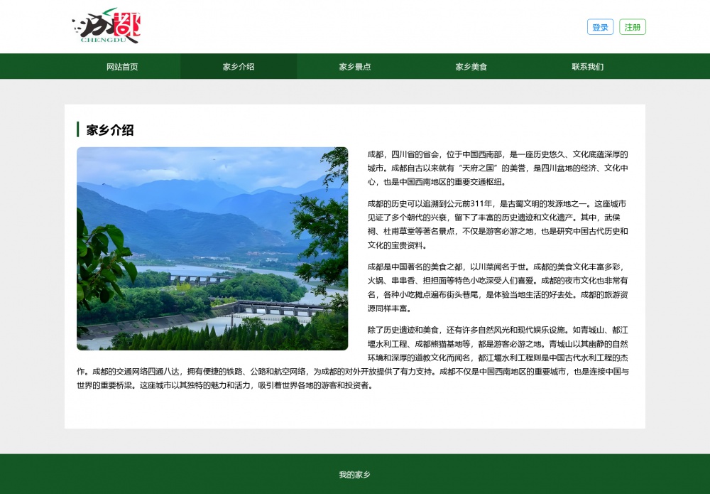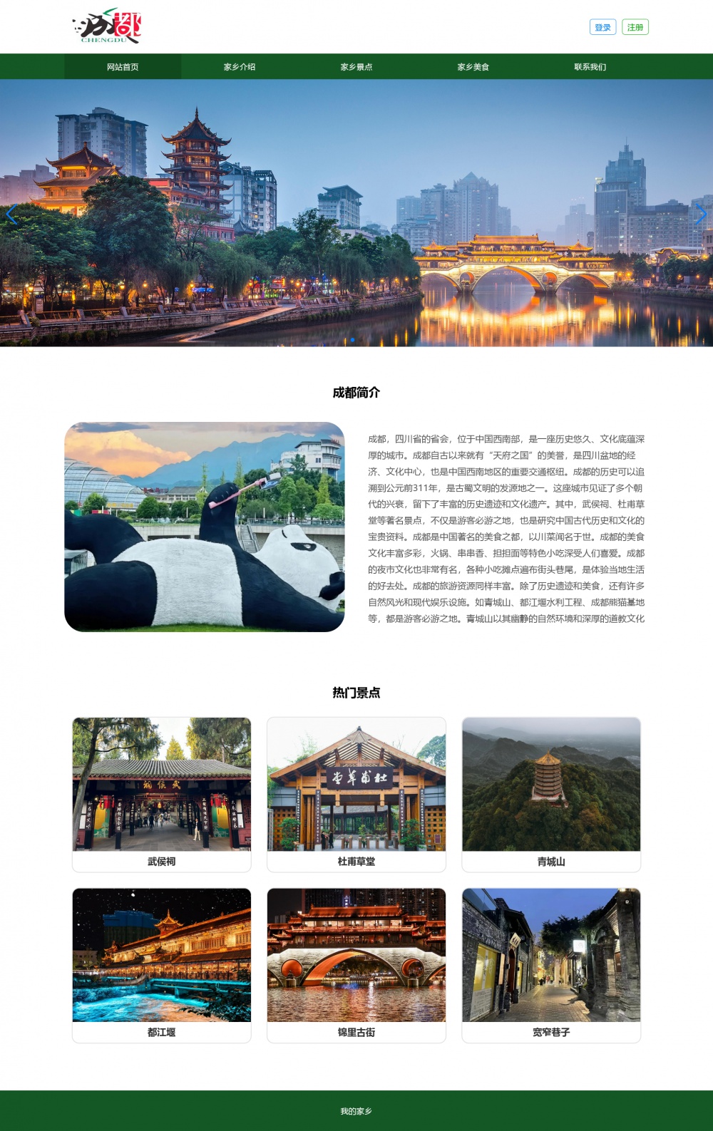 页面采用html5+css3+js开发,代码简洁易懂,适合作为成都家乡介绍网站设计项目。