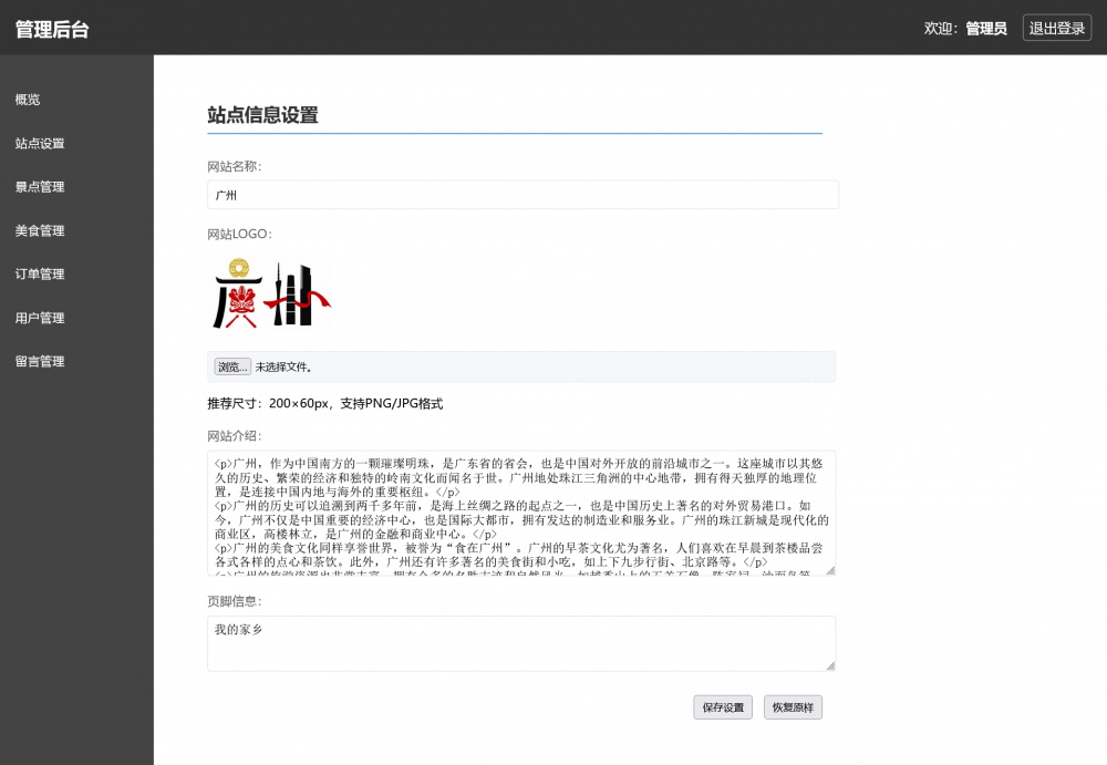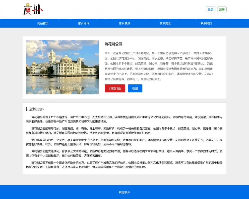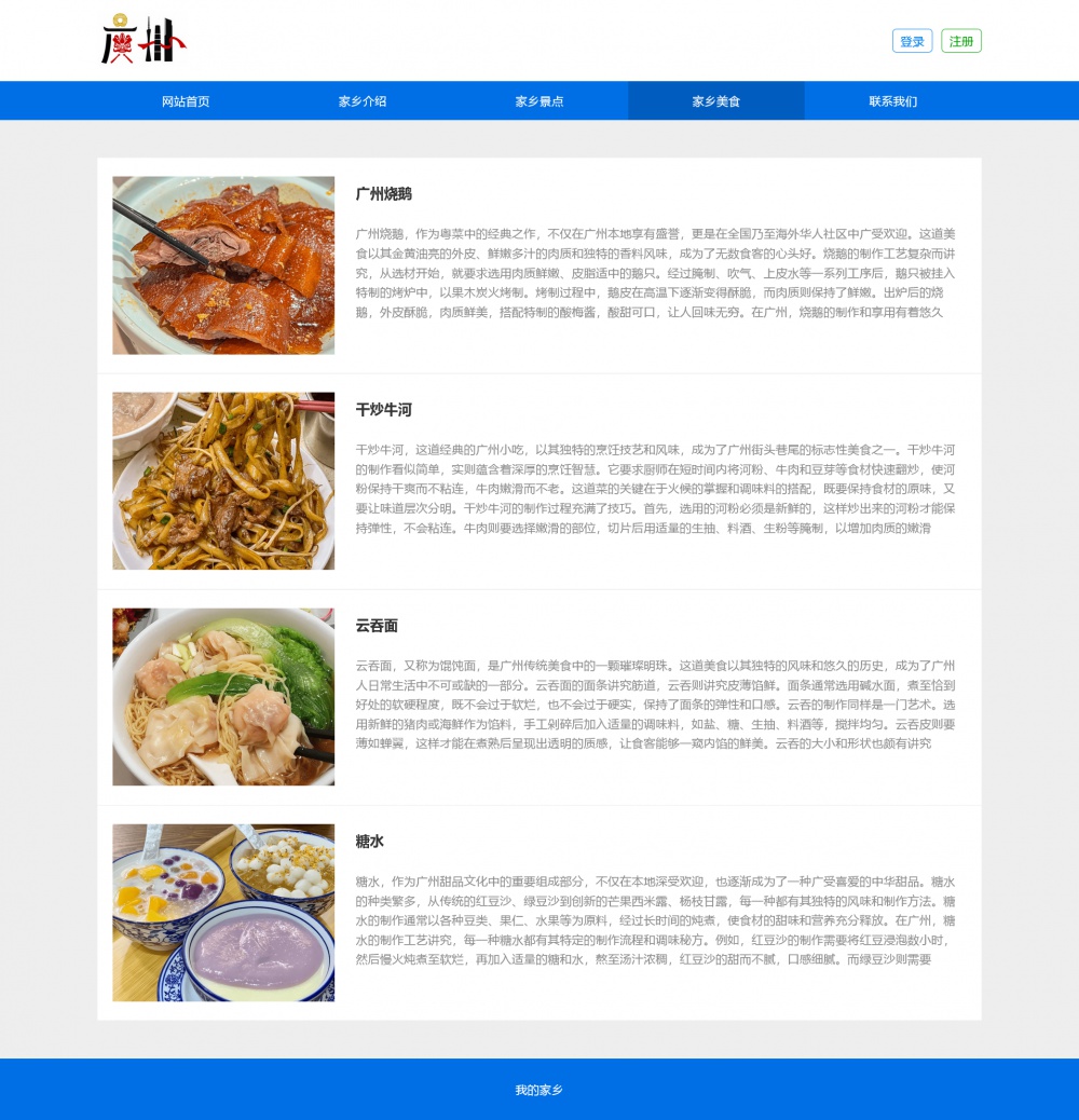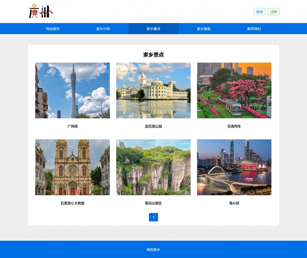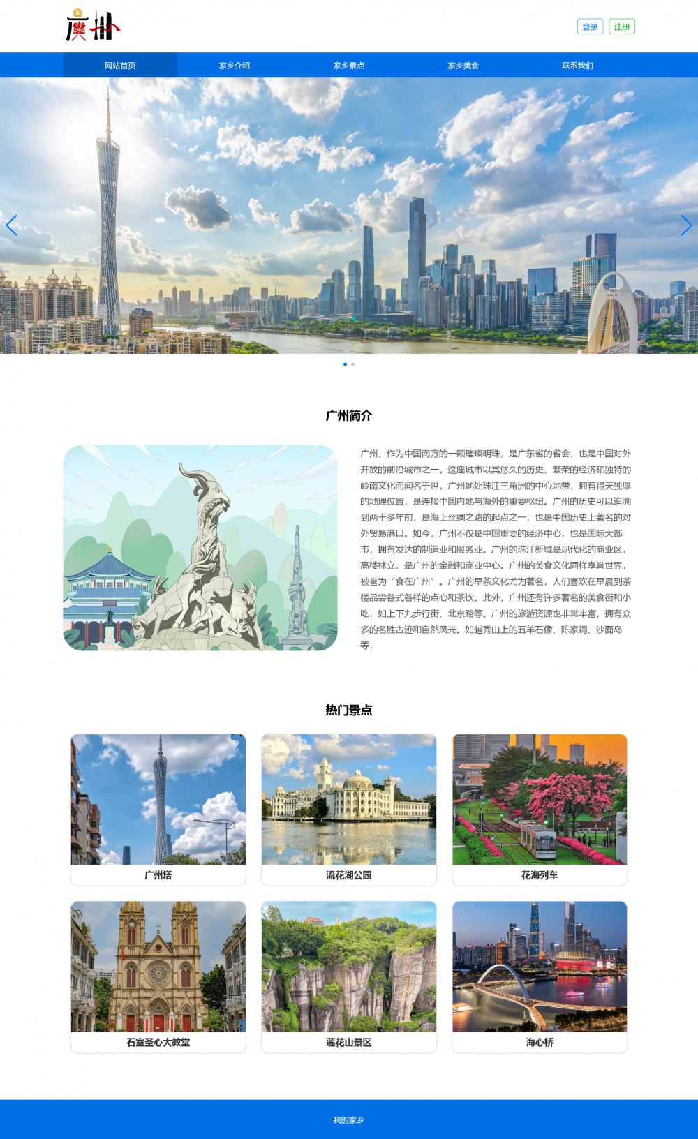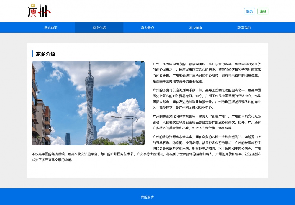 页面采用html5+css3+js开发,代码简洁易懂,适合作为广州家乡介绍网站设计项目。