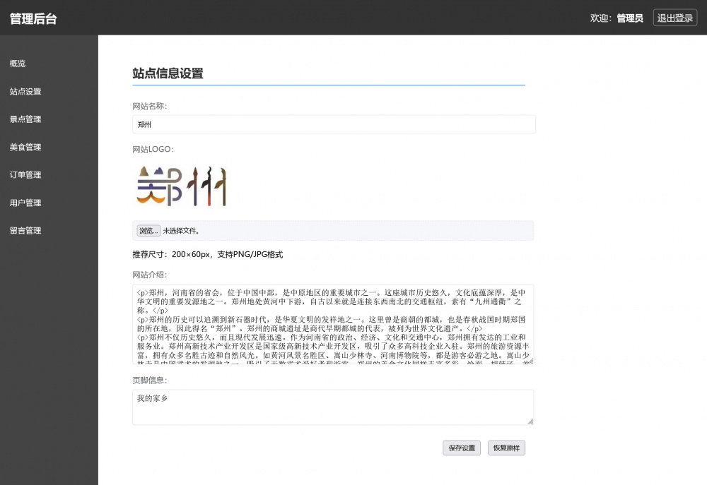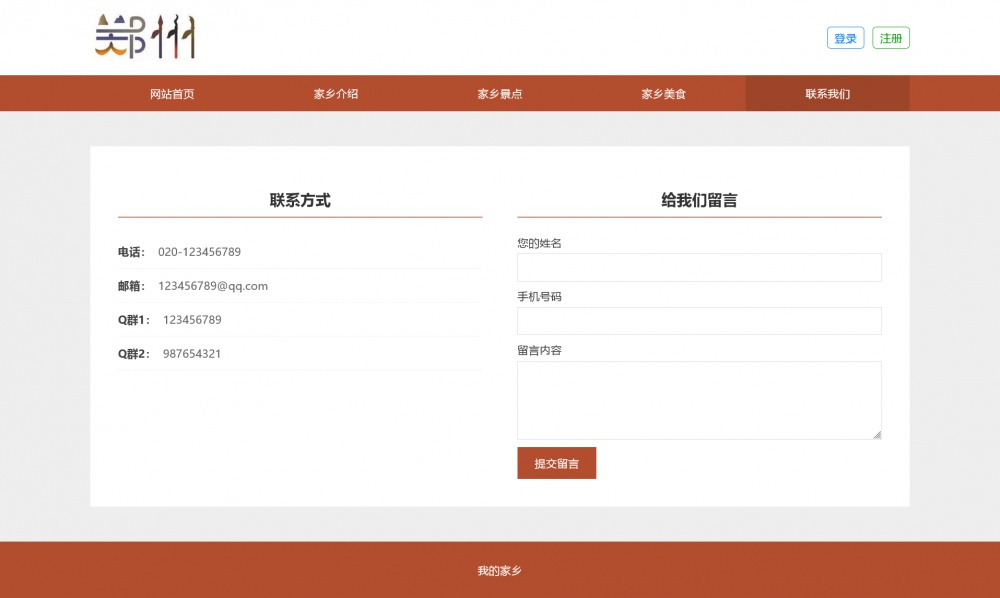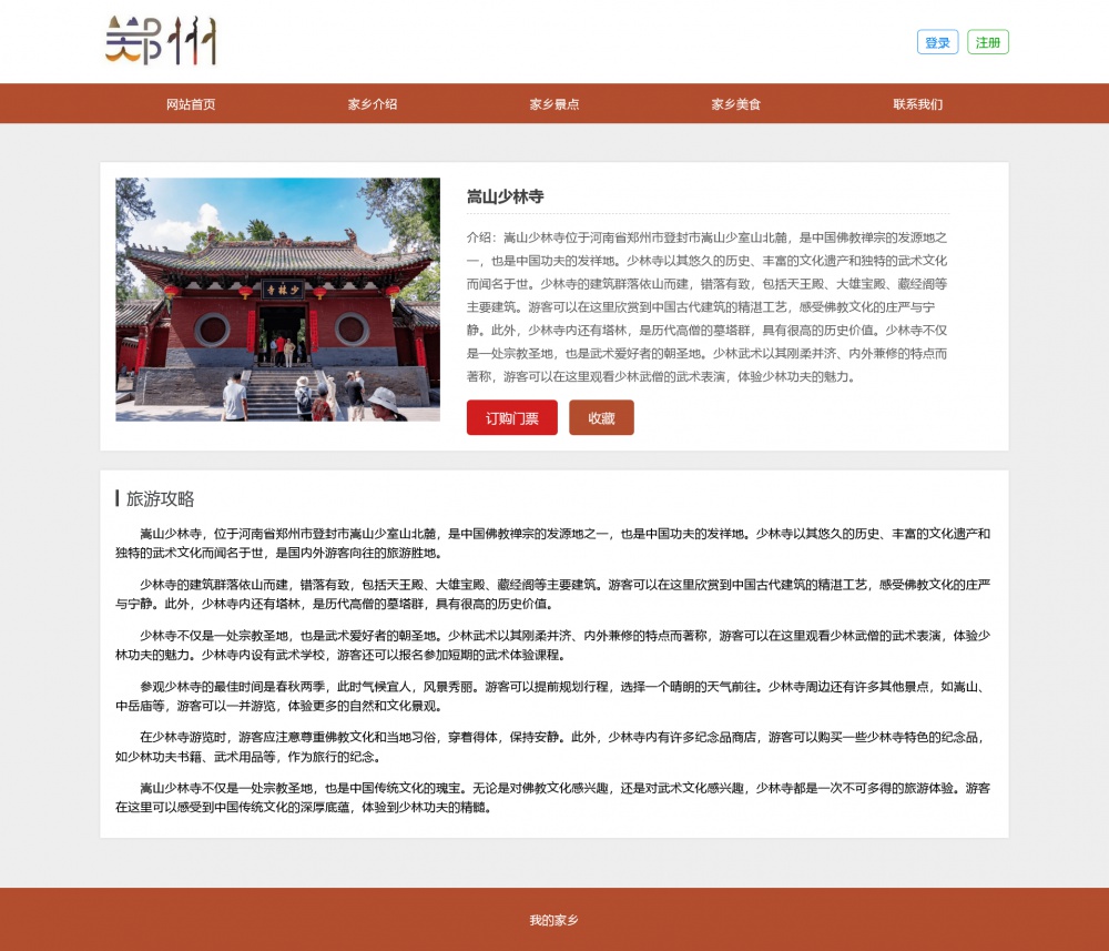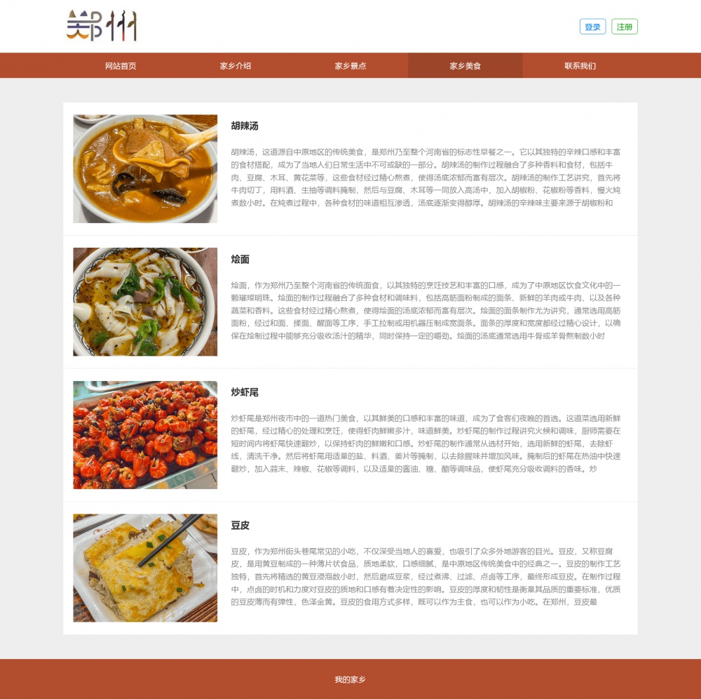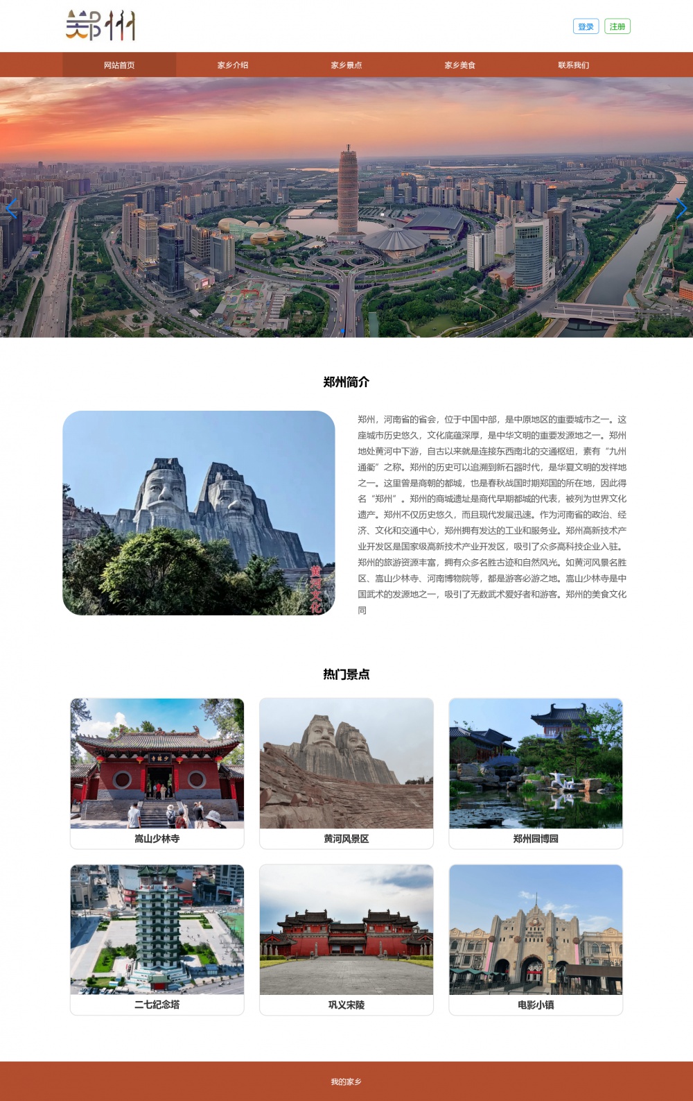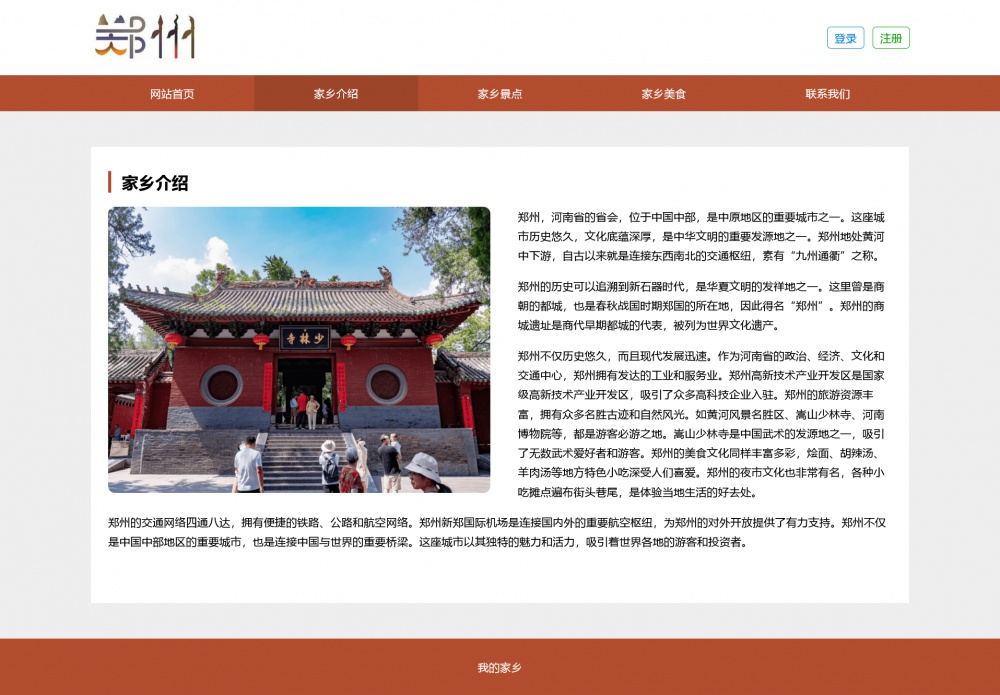 页面采用html5+css3+js开发,代码简洁易懂,适合作为郑州家乡介绍网站设计项目。