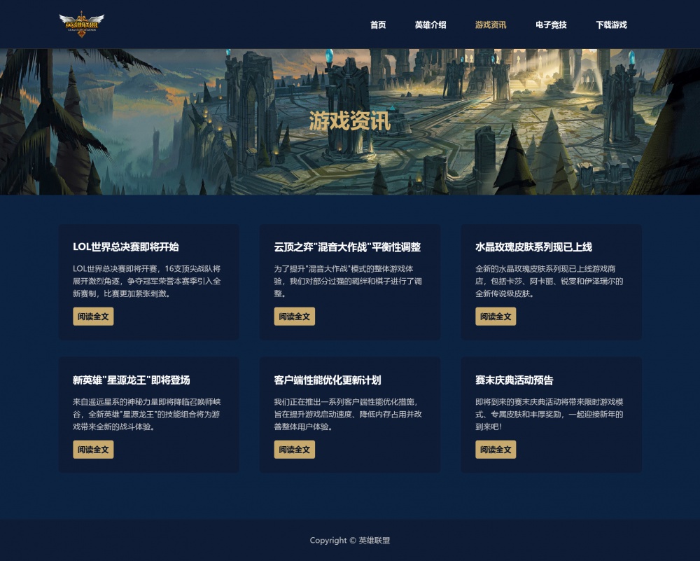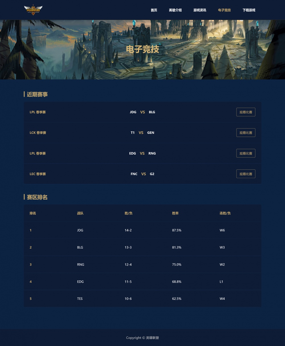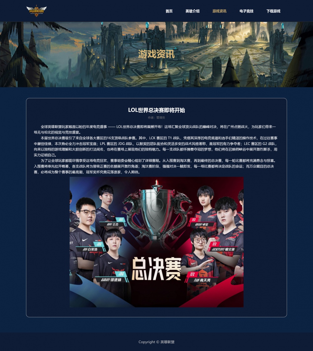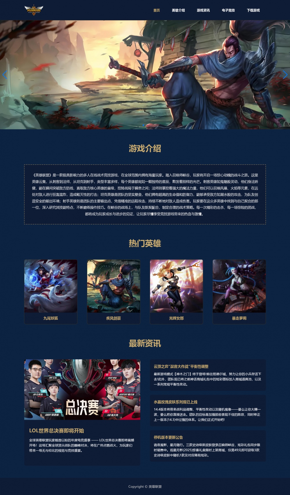 游戏《英雄联盟》网页设计模板,深色风格炫酷好看,页面布局简单代码规范。