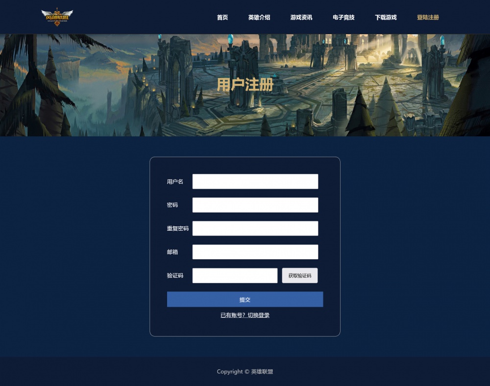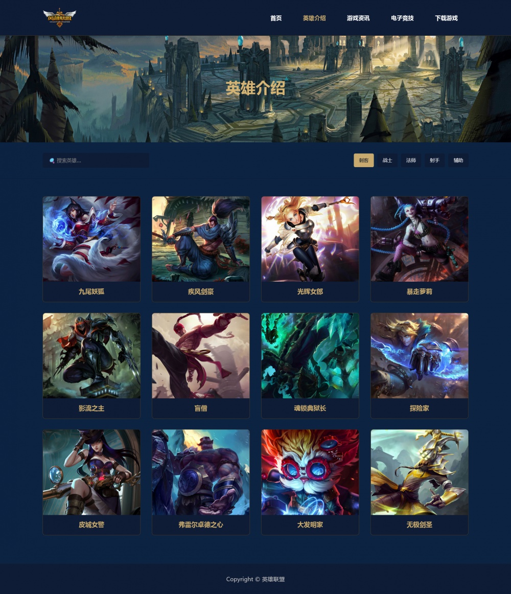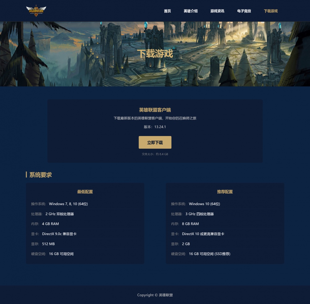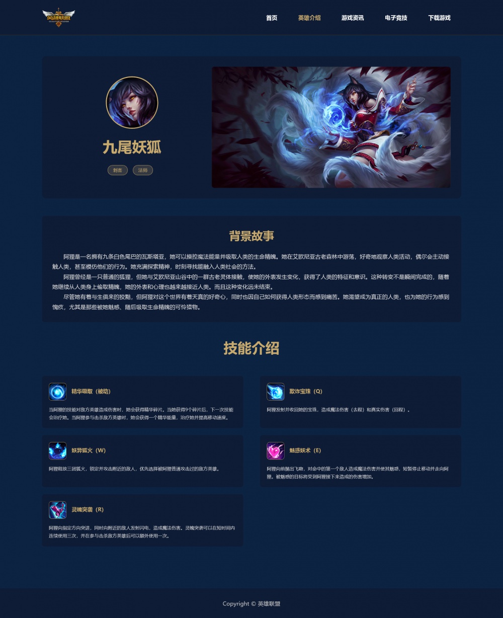 游戏《英雄联盟》网页设计模板,深色风格炫酷好看,页面布局简单代码规范。