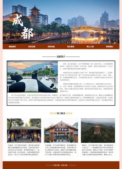 网页介绍: 这是一套关于成都家乡旅游介绍的网页设计模板,共有11个页面,也可自行复制多几个页面进行修改,代码好改。网页采用flex布局、带有三级页面、有css过渡效果、风土人情...