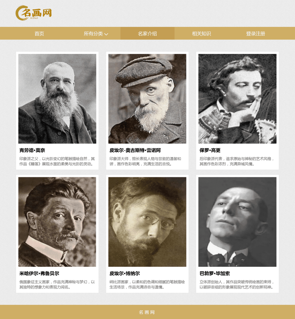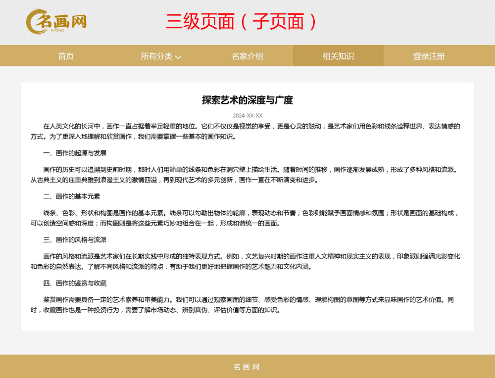 这是一套名画网网页设计模板,适用于古典文化类网页设计作业。网页整体采用浅灰色背景图,搭配中国风图片素材,使网页更有古典韵味。 网页可选8页或11页。采用了flex布局、包含超链接、表单、表格、css动画等基础技术,也可额外添加响应式布局、js轮播图、下拉菜单、css过渡、带网页报告等技术(需要勾选复选框)。
