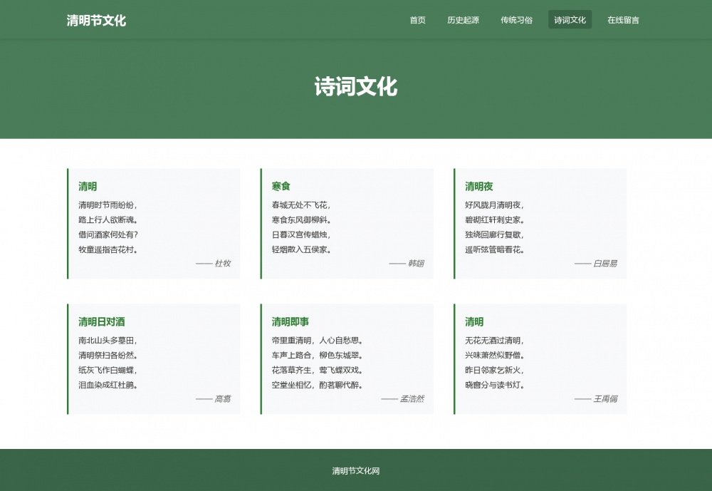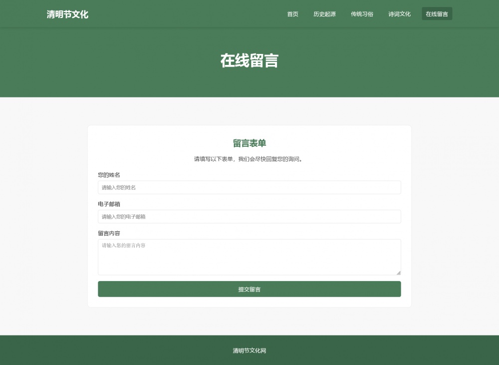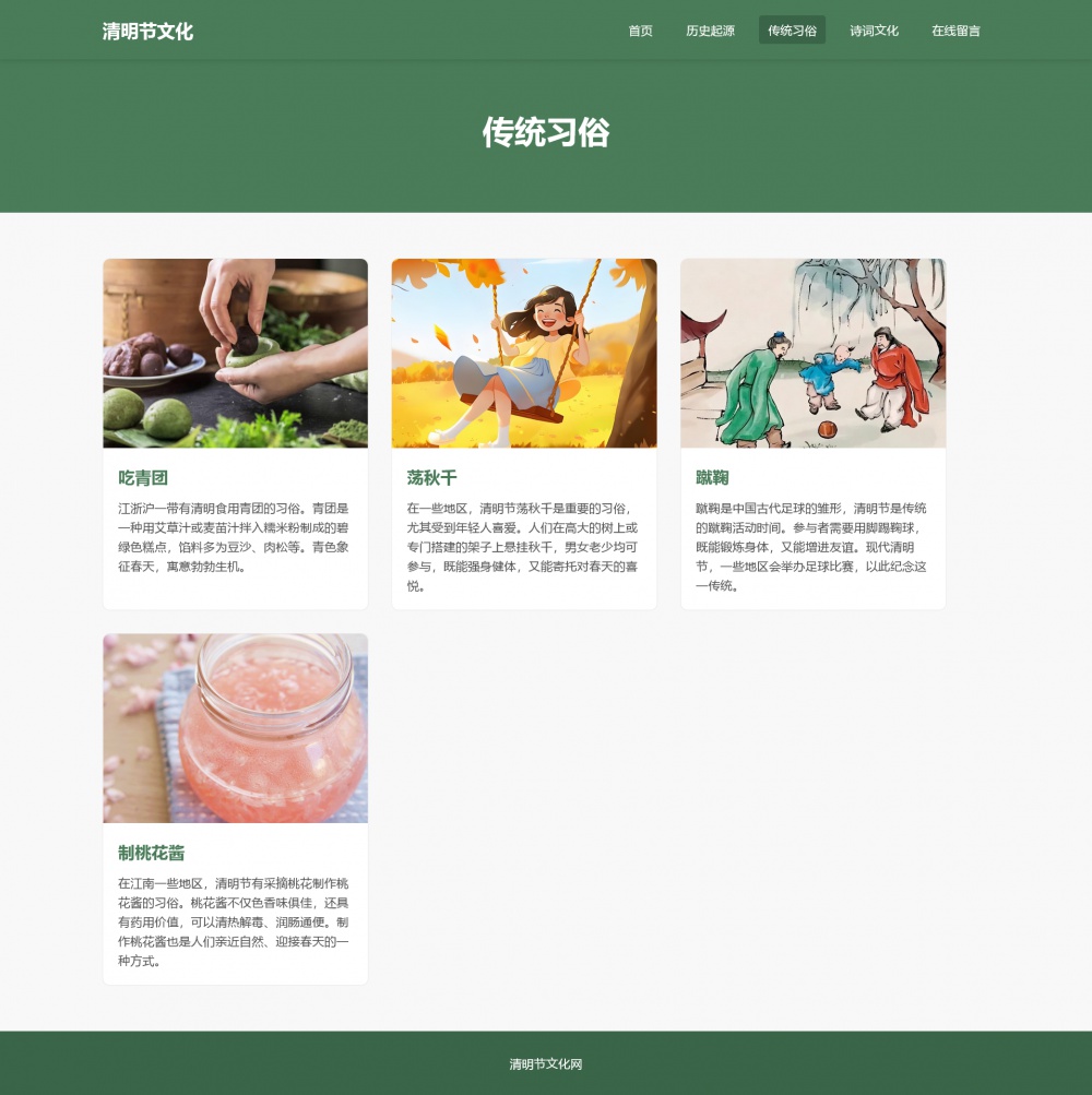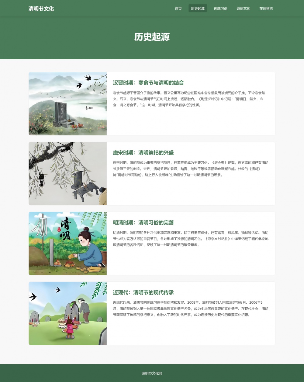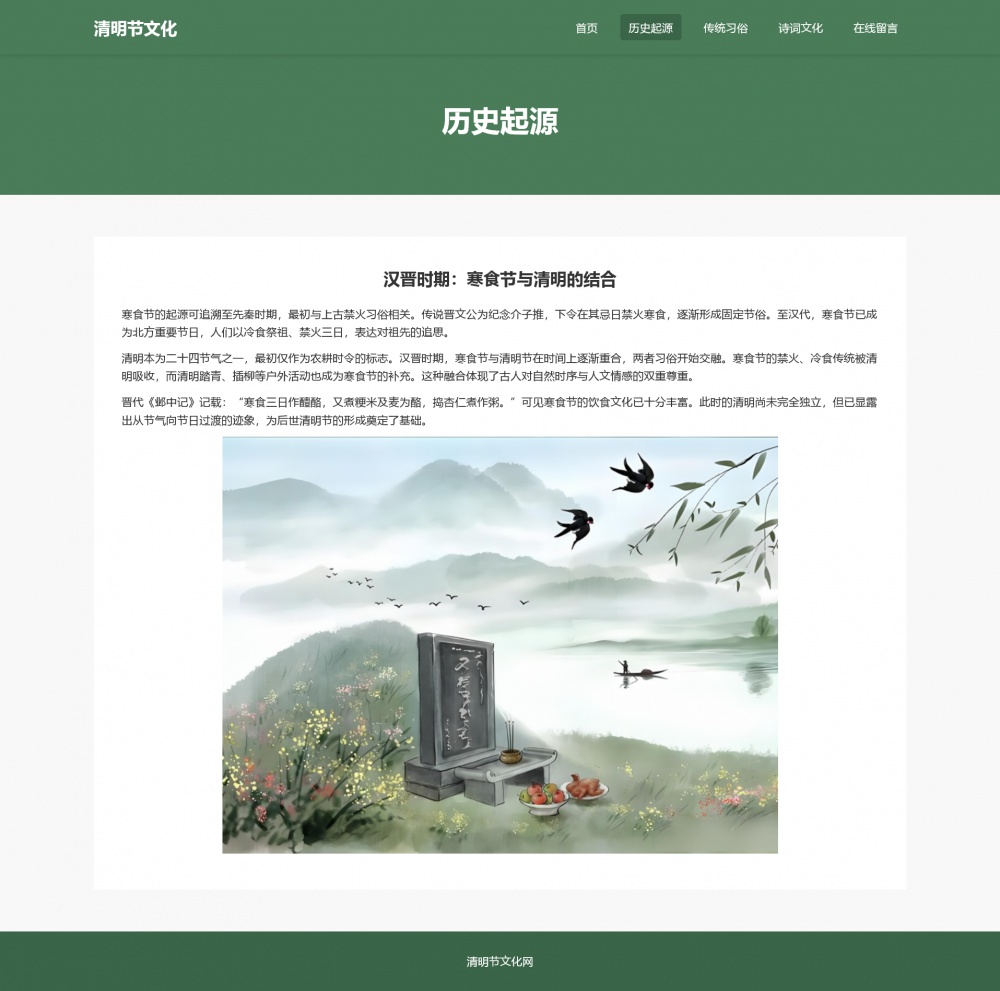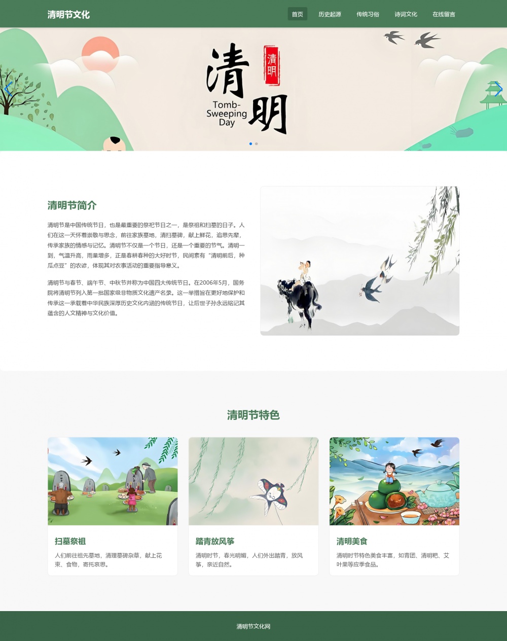 清明节节日网页模板,页面好看、代码简洁、图片精美,是套优秀的web网页设计案例。默认是5页的html+css简单版本,也可以选择加三级页面(多加4页),或者添加轮播图、表单验证、响应式布局(bootstrap)等js技术,没学过的技术建议不选。选完点击下载即可。可作为清明节网页模板,节日文化网页设计作业等。