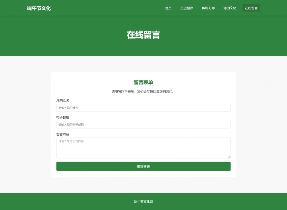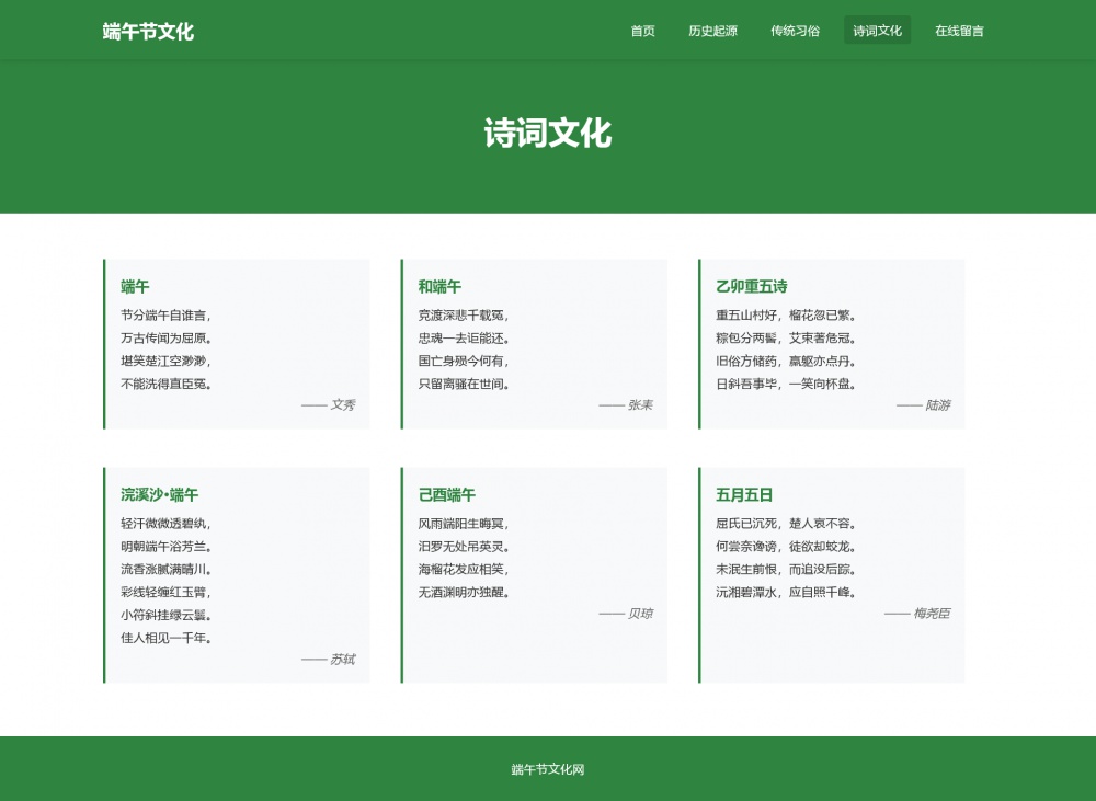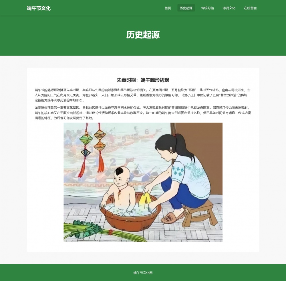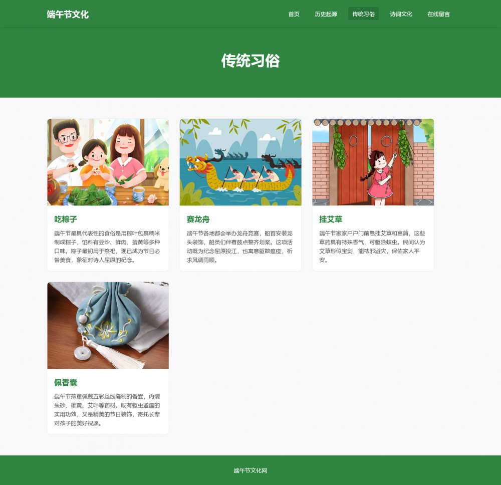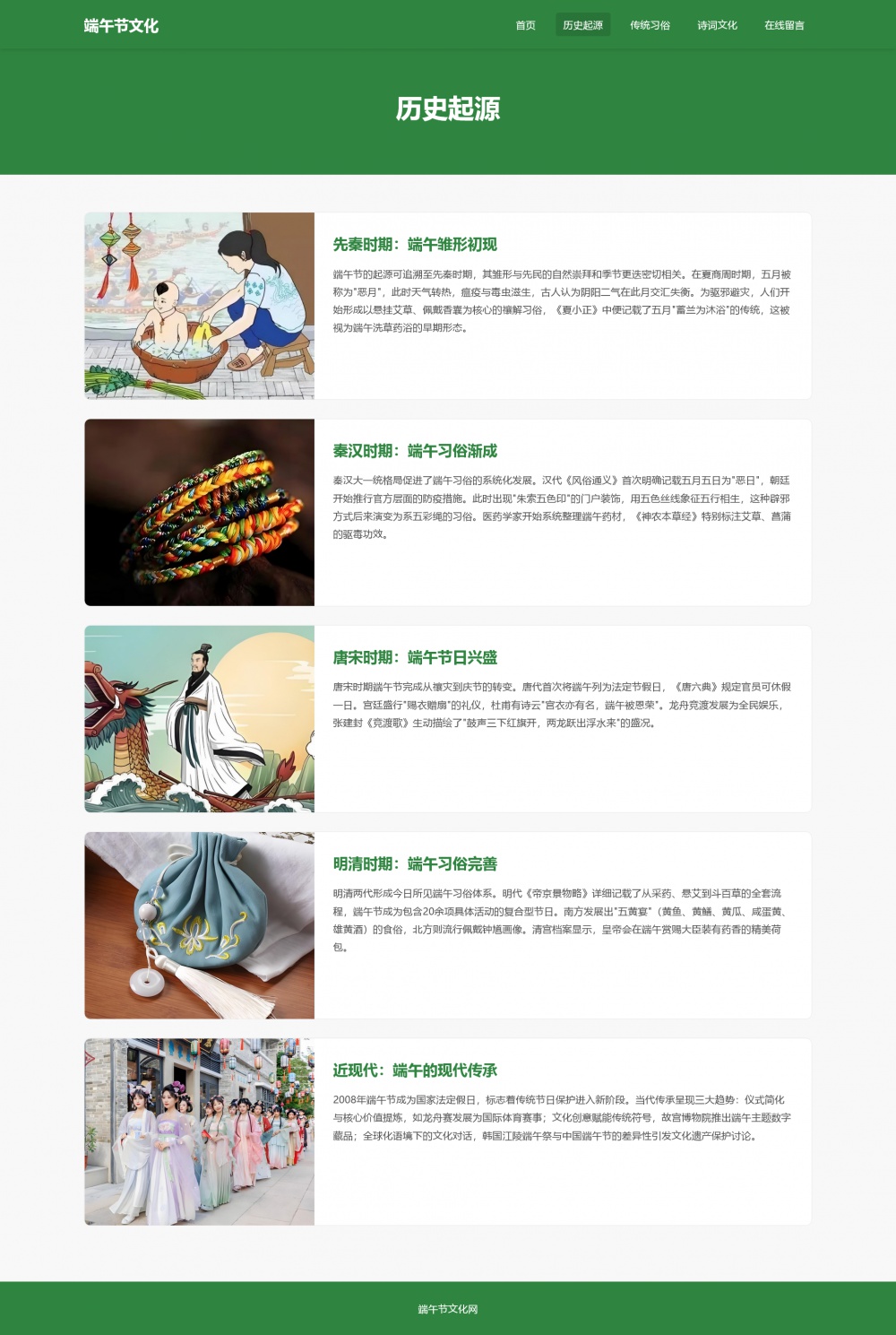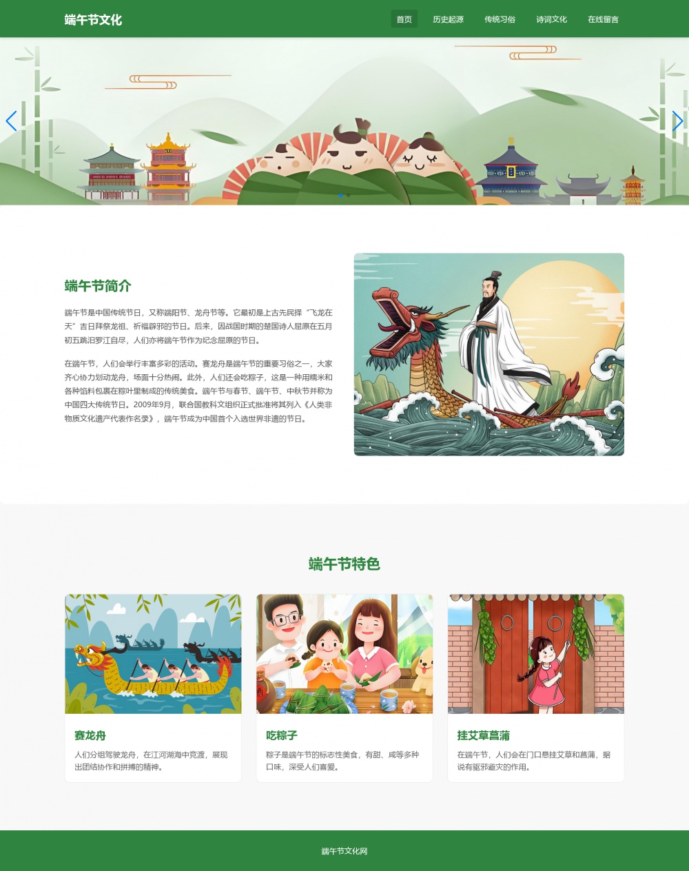 端午节节日网页模板,页面好看、代码简洁、图片精美,是套优秀的web网页设计案例。默认是5页的html+css简单版本,也可以选择加三级页面(多加5页,总页数变成10页),或者添加轮播图、表单验证、响应式布局(bootstrap)等js技术,简单复杂可选,没学过的技术建议不选。选完点击下载即可。可作为端午节网页模板,节日网页设计作业参考等。
