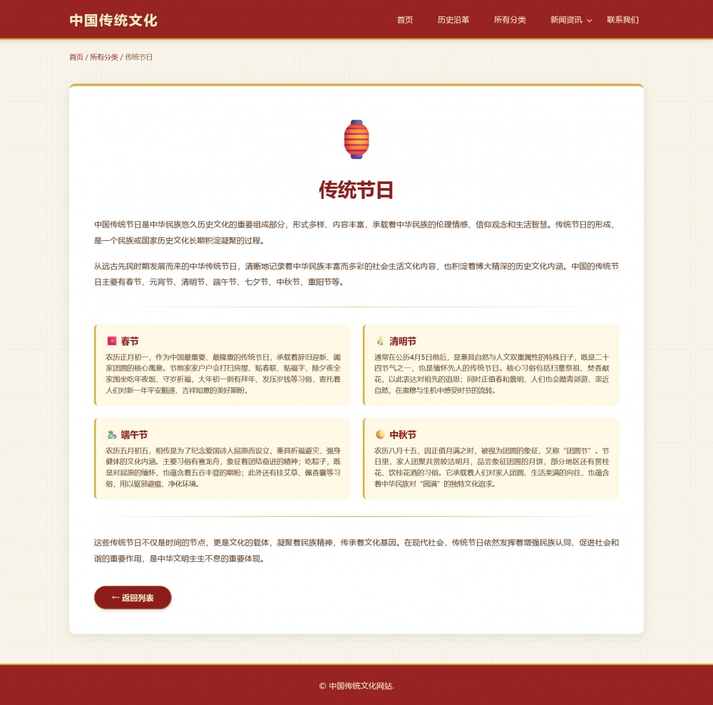 默认是5页的简单版本(无js),也可以选择复杂版本,例如选择响应式布局则网页会自适应移动端(采用简单的css3媒体查询和js实现,无框架),添加三级页面则变成12页版本,添加js效果则分类页有筛选功能,添加表单验证则会验证手机号和邮箱格式并在通过后跳转首页,简单复杂可选,具体效果可看演示,根据个人需求选择即可。可作为期末传统文化网页设计模板,传统文化网站前端页面等。