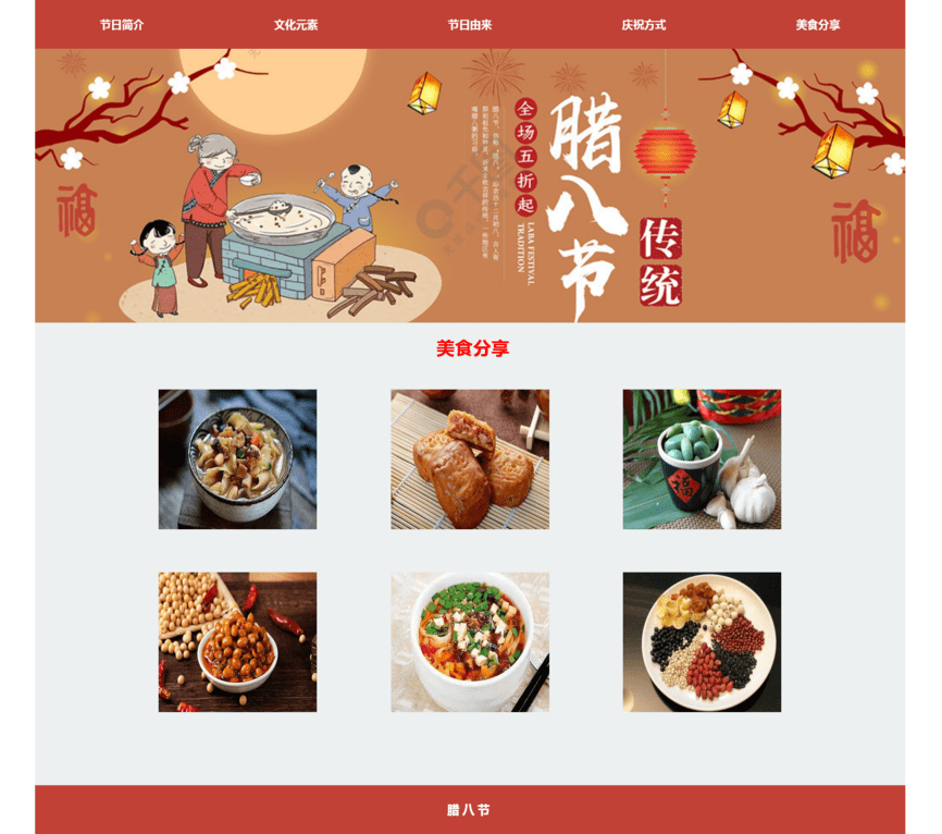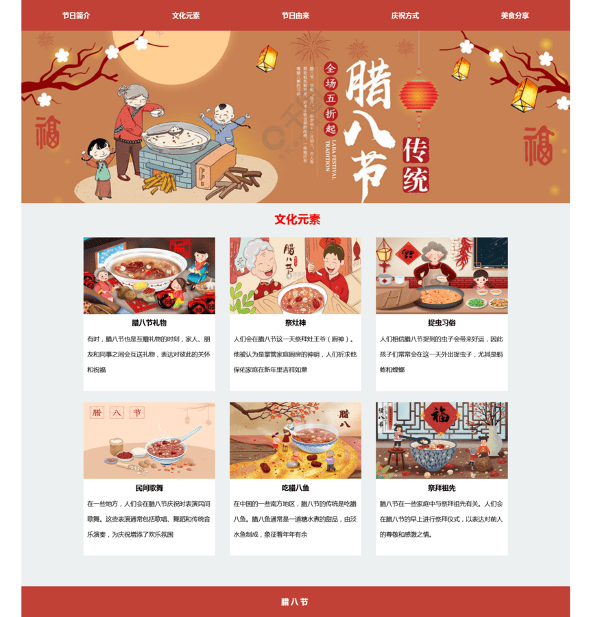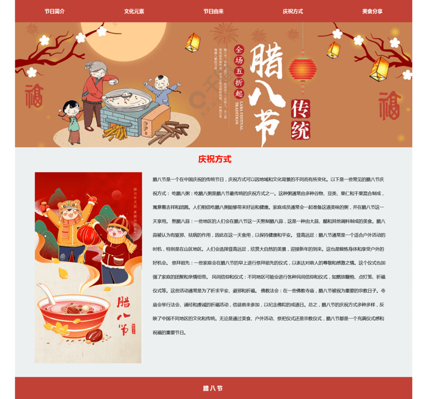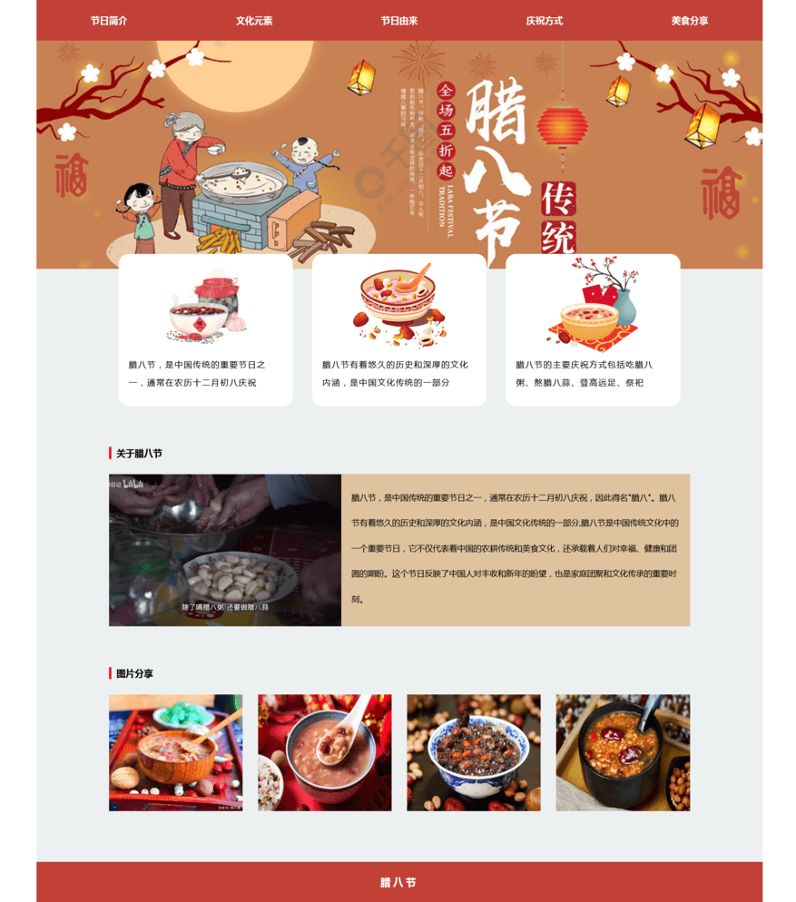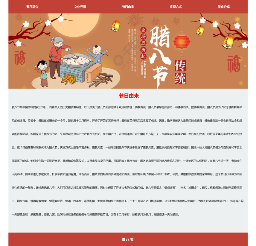 这是一套腊八节节日主题html+css网页模板,采用html5技术,代码规范简单好改,非网上那些泛滥老旧杂乱代码。模板共有5个页面。可以作为腊八节节日介绍、传统节日主题web期末大作业参考案例,也可以用来搭建一个节日介绍网站。